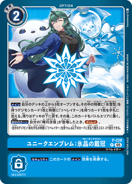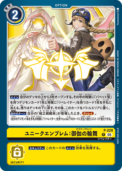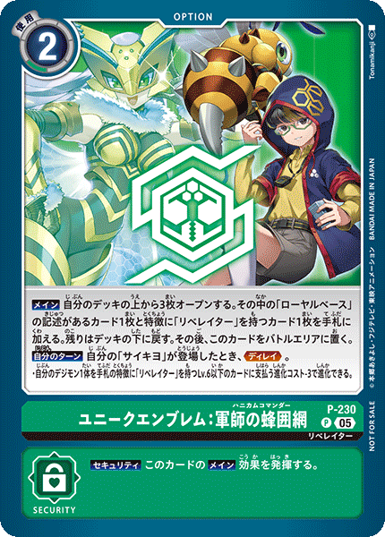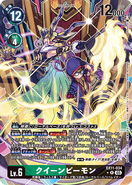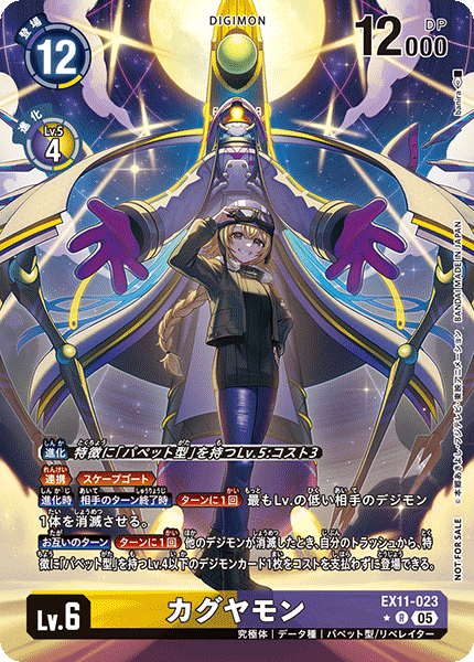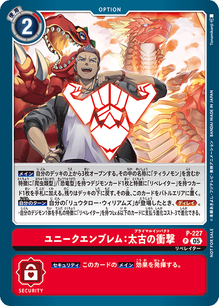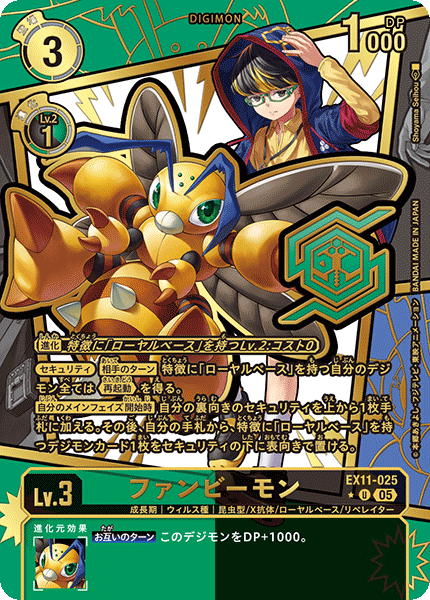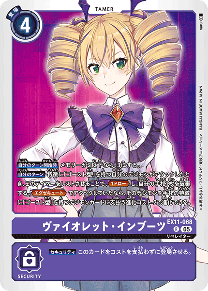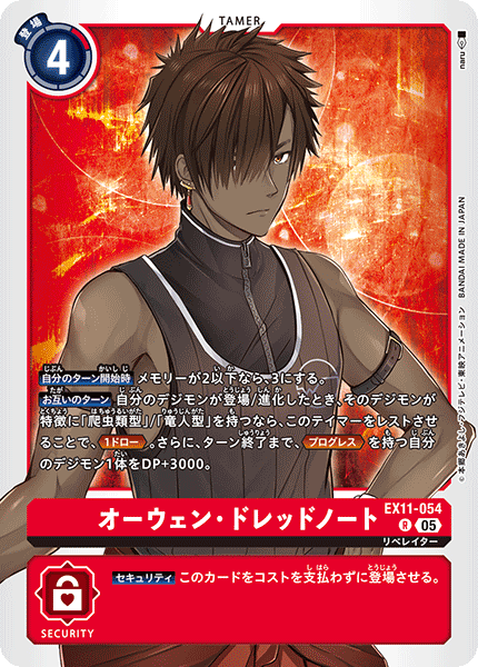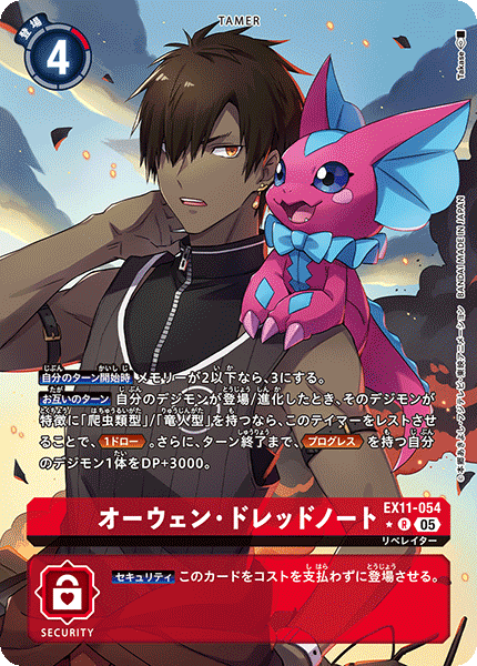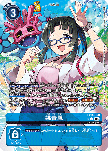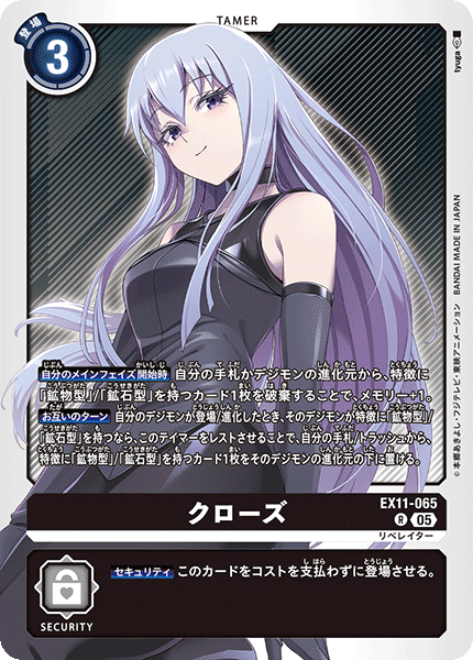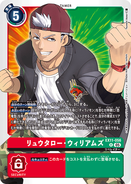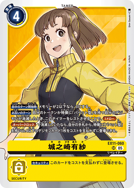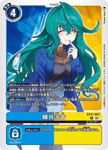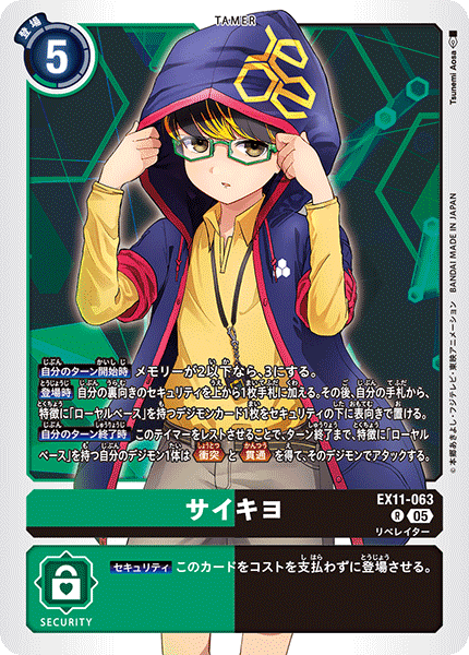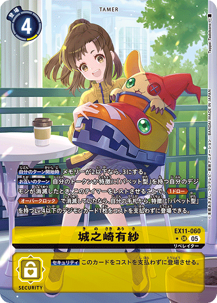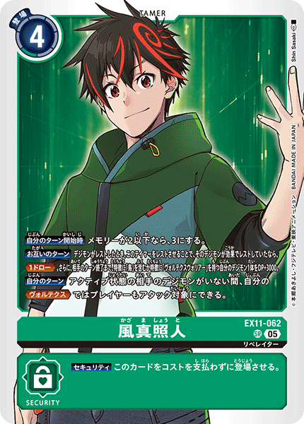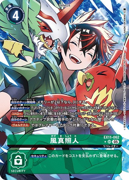 ③今弾から追加された「バトルに勝ったとき」という誘発条件は、なんとセキュリティデジモンとのバトルに勝つことでも効果を発揮できる。「EX11-062 風真照人」も併せて、相手のデジモンがいなくても攻めに行けるようになったのが今弾の特徴であり、最大の強みと言っていいだろう。